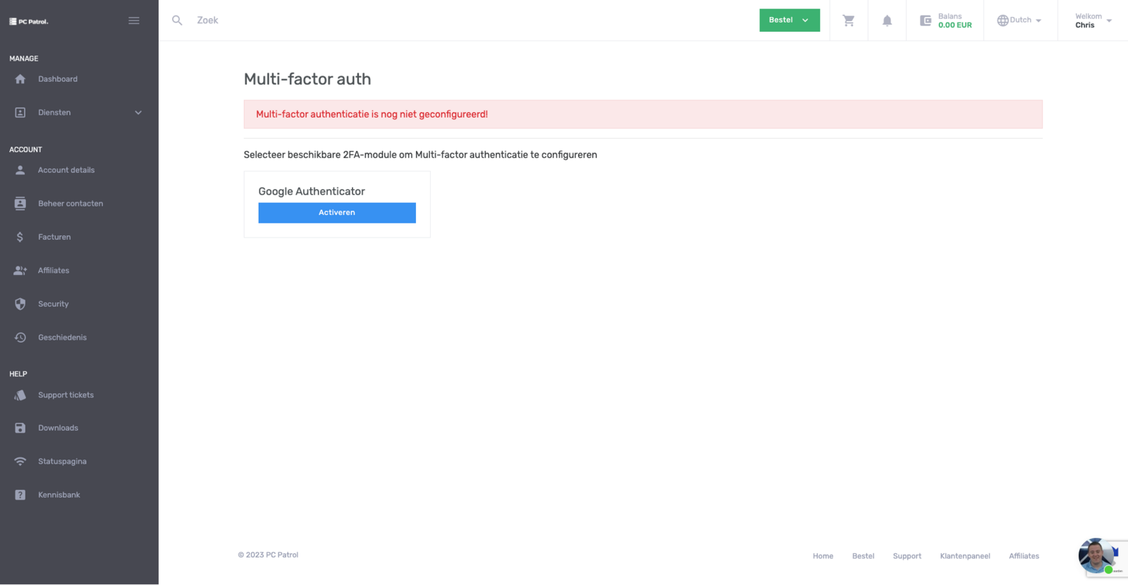 U komt nu in het scherm waar u twee-factor authenticatie kunt activeren. Dit doet u door Google Authenticator te selecteren en het activeringsproces volledig te doorlopen.